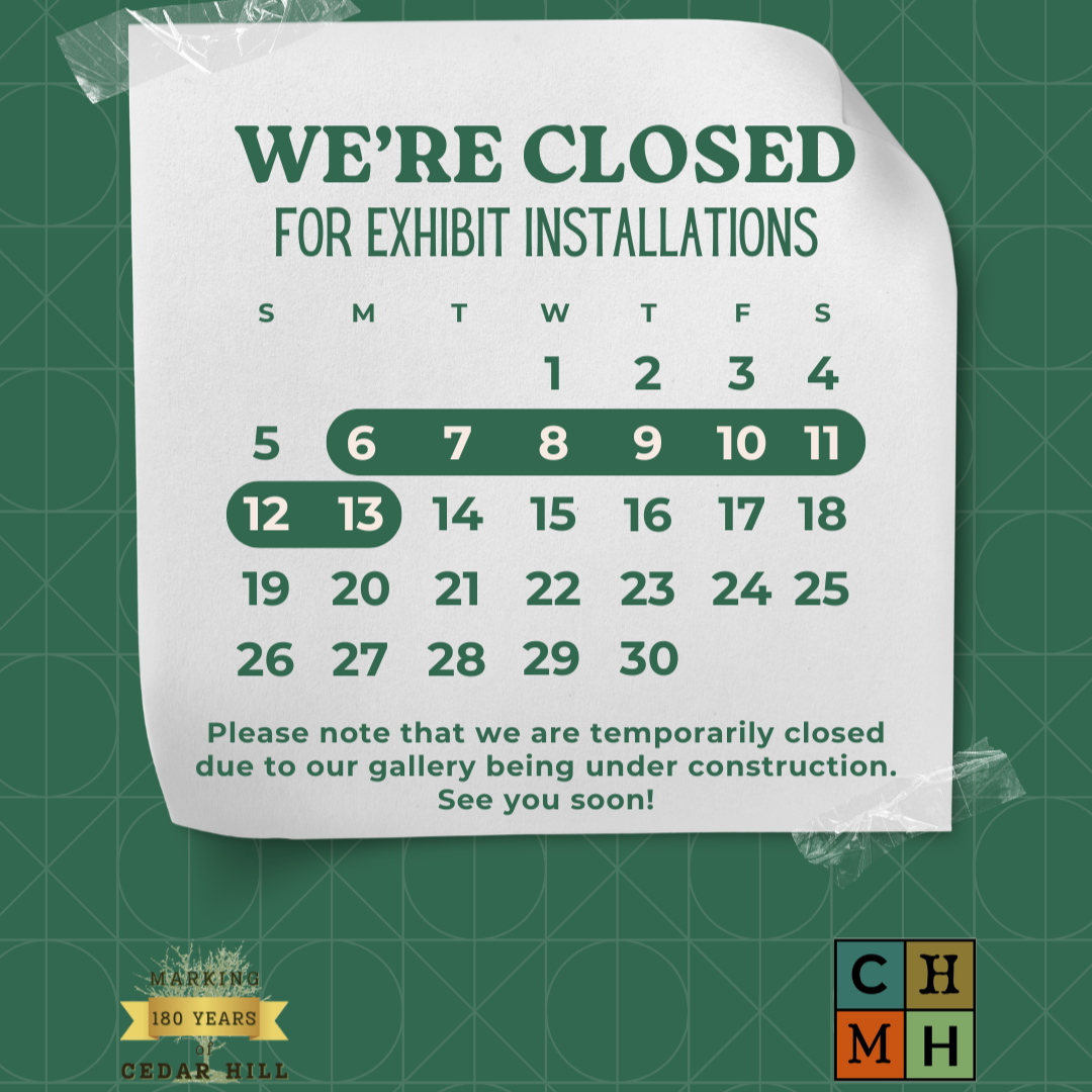 The Cedar Hill Museum will be temporarily closed for the week of April 6th-13th as we get new exhibits installed in our gallery.